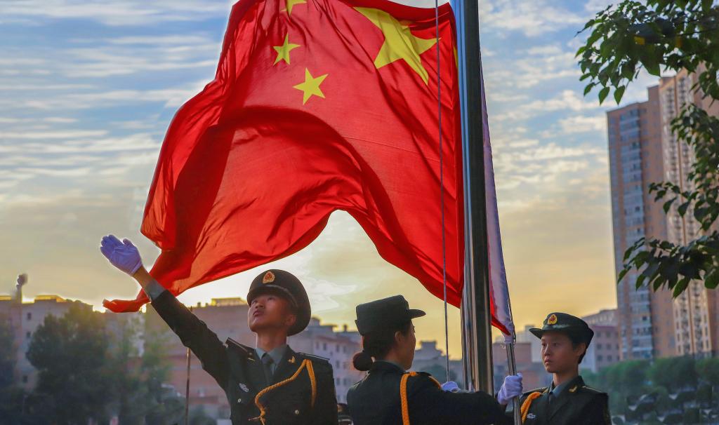7时整,五星红旗迎着朝阳冉冉升起,军训团行军礼,全体师生高唱国歌。文学院员工代表左斌同学以《爱国情深,报国志坚》为题,为全体师生做演讲,他通过讲述新中国成立70年来祖国发生的伟大巨变,激励和教育当代青年要勇于担当历史使命,把个人理想融入到国家的事业中,志存高远,脚踏实地,努力践行爱国奋斗精神,立足本职,为中华民族伟大复兴作贡献。随后,文学院2018级50名同学集体朗诵《少年中国说》,他们手持红黄两色花球,摆出五星红旗和70的字样,铿锵有力的诵读声展现了新时代创新学子的良好精神风貌,激情澎湃的旋律点燃了在场师生的爱国热情。全体师生及军训团教官手挥小国旗和气球,高唱《歌唱祖国》,为新中国成立70周年献礼。