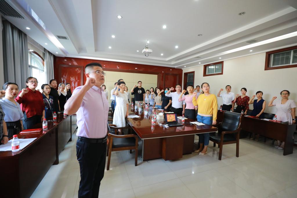 随后,举行了新入职教职工宣誓仪式,教务处处长刘劲飞带领全体参会人员宣誓,用铿锵有力的声音许下了庄重承诺,铮铮誓言在学校上空回荡,打动师心,永铸师魂。