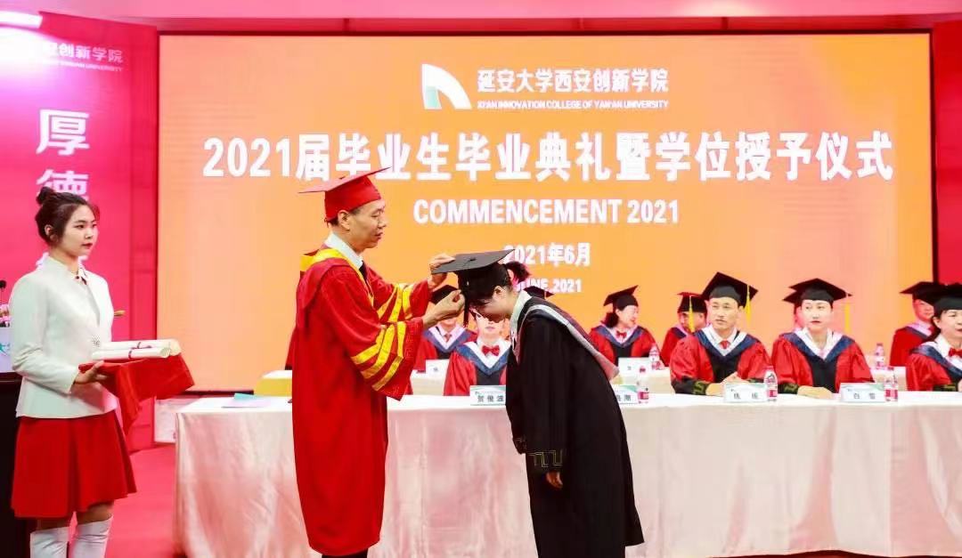 本网讯 6月24日上午,yl23411永利官网2021届毕业生毕业典礼暨学位授予仪式在老员工活动中心举行,1946名毕业生圆满完成学业,逐梦新征程。因疫情防控工作需要,今年毕业典礼采用线上与线下相结合的方式举办,校领导崔海潮、陈瑶、贺俊波、拓欣、白雪、侯延丽,学校学位委员会委员蔡静波、张丹、陈德、赵华鹏、闫文耀、张恒、刘劲飞,190余名毕业生代表,7名教师代表,6名辅导员代表参加现场毕业典礼,其他毕业生通过观看网络直播的方式“云端”参与。毕业典礼由副董事长拓欣主持。