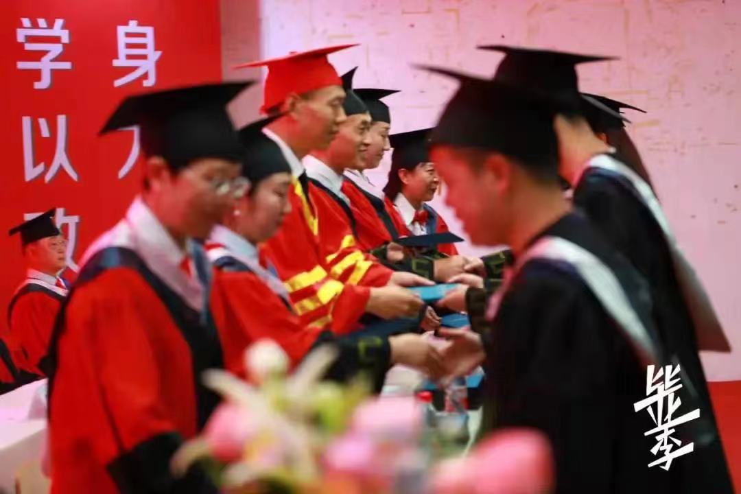 当雄壮的国歌响起,全体师生齐声奏唱国歌,毕业典礼拉开了帷幕。公司党委书记陈瑶宣读了学校《关于准予何婷玉等1946名员工毕业的决定》和《关于授予卜琼等1941名同学学士学位的决定》。校领导共同为毕业生代表颁发毕业证书,学校董事长、学位委员会主席崔海潮为毕业生代表颁发学位证书、执拨穗礼,并与毕业生一一合影留念。