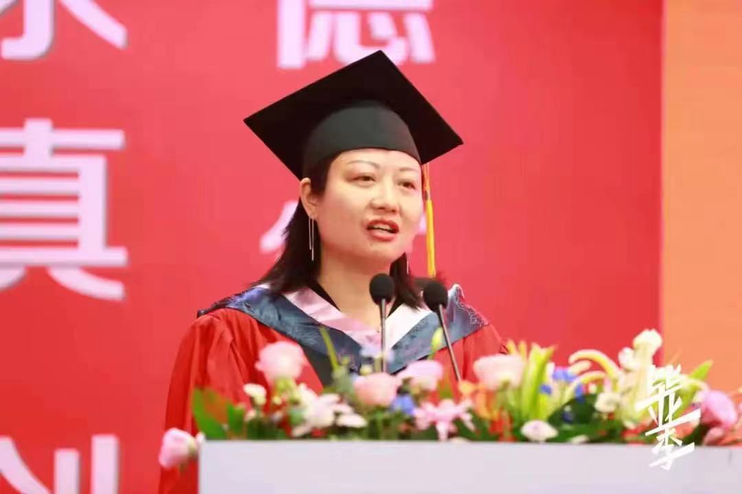 教师代表、文学院李娟副教授发言,她寄语毕业生们在心中要有远方的理想与幸福,不苟且于当前,不羡慕于浮华;要活出自己,担当责任,寻到人生方向,活出自己的价值;要心怀感恩,对父母、学校和我们这个时代感恩,在人生更大的舞台上展现青春风采。王宴之老师将对毕业生的祝贺和殷切希望寄于歌声之中,高歌一曲《不忘初心,牢记使命》,希望同学们在人生新的征途中继续努力,回报学校与社会。