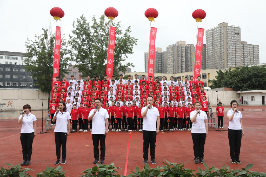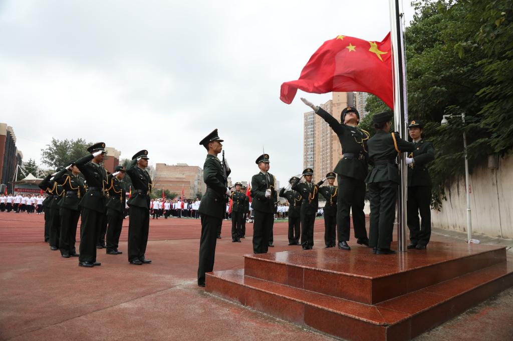 英姿飒爽的国旗护卫队护卫着鲜艳的五星红旗走到升旗台前,伴随着《义勇军进行曲》激昂的旋律,鲜艳的五星红旗冉冉升起,在场师生迎着朝阳凝视国旗,共唱国歌,行注目礼。