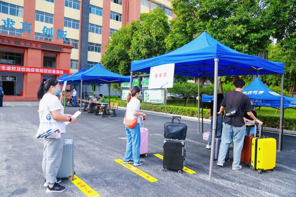 为保证员工顺利返校,学校提前做好校园清洁消杀与疫情防控应急演练等工作。上午7点30分,学校工作人员全部就位,严阵以待,迎接首批返校员工。在学校工作人员和教师志愿者的指引下,返校员工按要求全程佩戴口罩,进校保持1米以上安全间隔有序排队。经过卫生消杀、核验健康码、首次测温、消毒和更换口罩后,员工走进测温通道进行二次测温,体温测量正常进入各学院登记处登记,并提交健康承诺书,所有查验完成后领取通行证前往宿舍区。宿舍区前,宿舍管理员为返校员工再次测量体温,办理入住登记。