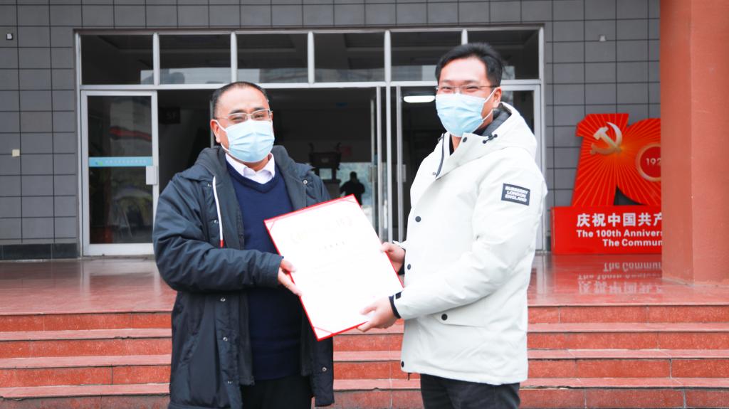 集团疫情防控办主任武宝宁代表学校接受捐赠,并对丁贵亮员工的母校情怀和刘超先生的大爱表示衷心感谢。他表示丁贵亮员工长期以来关心学校的发展,刘超先生默默奉献爱心,用实际行动助力“疫”线,公司一定会妥善使用这批物资,开展疫情防控工作。随后武宝宁为丁贵亮员工颁发捐赠证书。