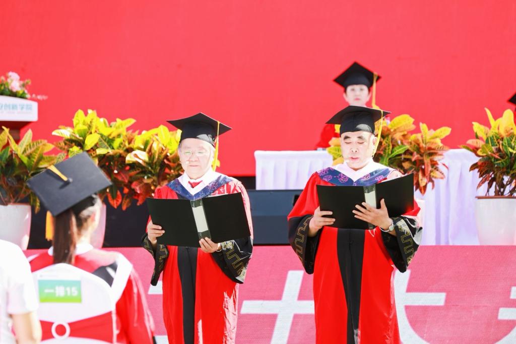 贺俊波宣读《关于准予2022届员工毕业的通知》《关于授予2022届毕业生学位的通知》文件,共授予2117人学士学位。校学位委员会主席崔海潮为毕业生代表颁发毕业证书、拨穗、正冠。