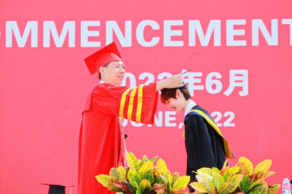 校学位委员会主席崔海潮为毕业生代表颁发毕业证书、拨穗、正冠