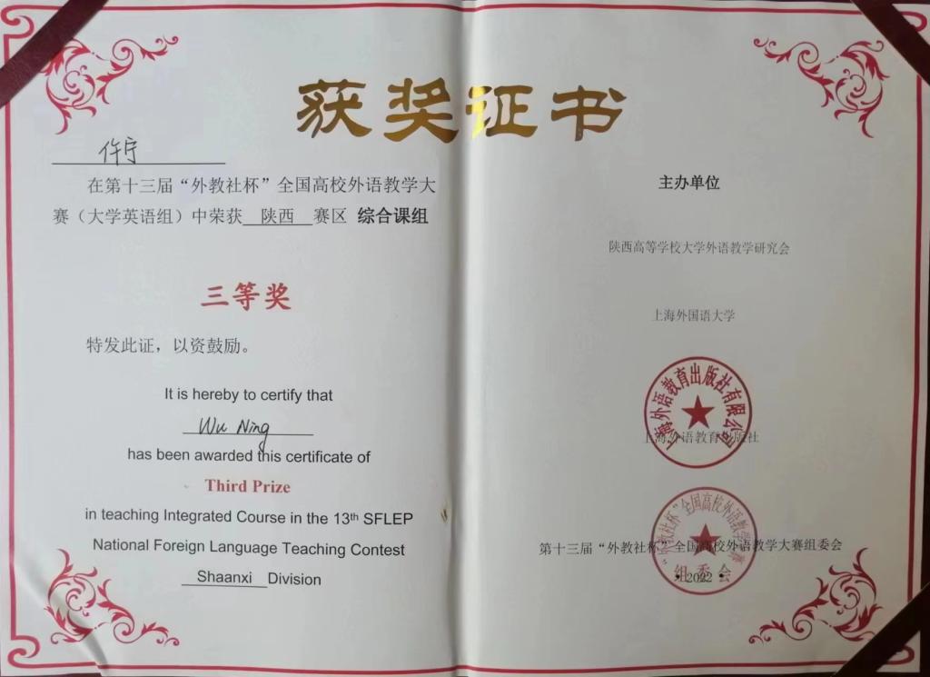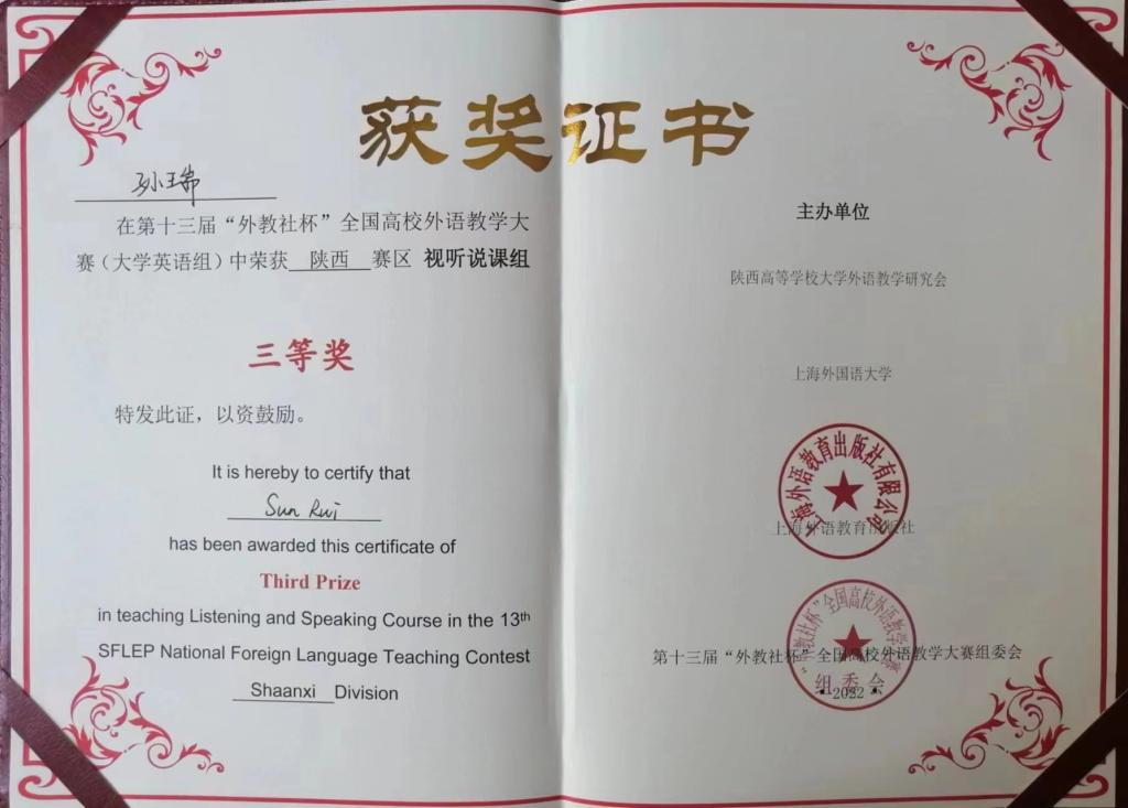 第十三届“外教社杯”全国高校外语教学大赛确定为大学英语组比赛,下设综合课组和(视)听说课组。大赛力求在保持英语课堂教学核心内涵的基础上,鼓励教师采用灵活适宜的教学方法,探索现代信息技术与课程教学的深度融合,提高教学与学习效果,满足信息化环境下的大学英语教学发展需要。公司yl23411永利官网专职教师孙瑞、仵宁分别荣获第十三届“外教社杯”全国高校外语教学大赛(大学英语组)中陕西赛区视听说课组、综合课组三等奖。