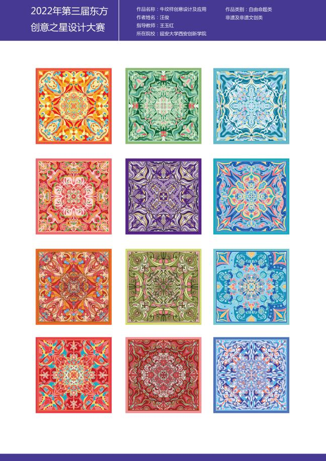 2022年8月23日,由国家工业和信息化部国际经济技术合作中心指导,东方创意之星设计大赛组委会主办,耘耕文创平台、纺织服装产业互联网研究院、各省赛承办院校承办的第三届东方创意之星设计大赛的省级获奖结果出炉,公司艺术与传媒学院视觉传达设计专业员工汪俊创作的《牛纹样创意设计及应用》荣获陕西(青海)赛区作品铜奖,指导教师为王玉红。