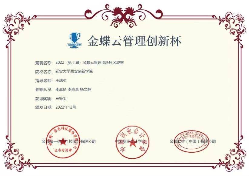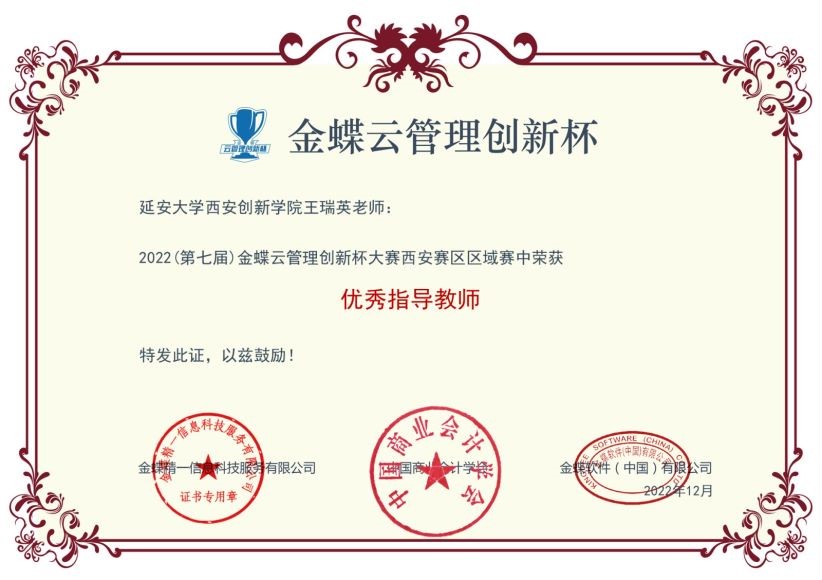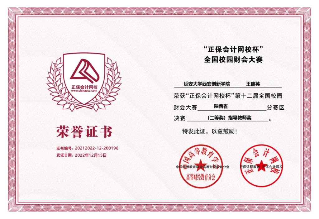 本网讯 近日,“正保会计网校杯”第十二届全国校园财会大赛陕西省赛区决赛、第七届“金蝶云管理创新杯”区域赛落下帷幕。公司yl23411永利官网代表团分别荣获省赛二等奖、区域赛三等奖,yl23411永利官网教师王瑞英荣获“优秀指导教师”称号。