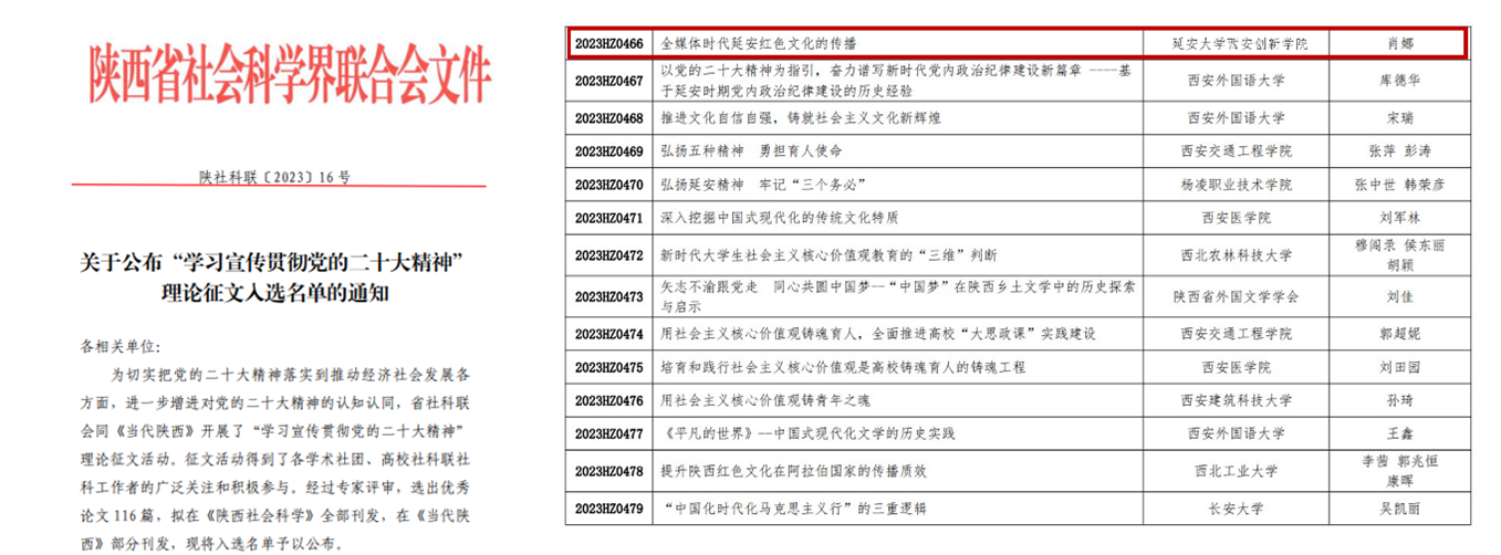 本网讯 近日,陕西省社会科学界联合会公布“学习宣传贯彻党的二十大精神”理论征文入选名单,公司文学院专职教师肖娜的论文《全媒体时代延安红色文化的传播》成功入选,并以“陕西省哲学社会科学研究专项”予以立(结)项,发放立(结)项证书。