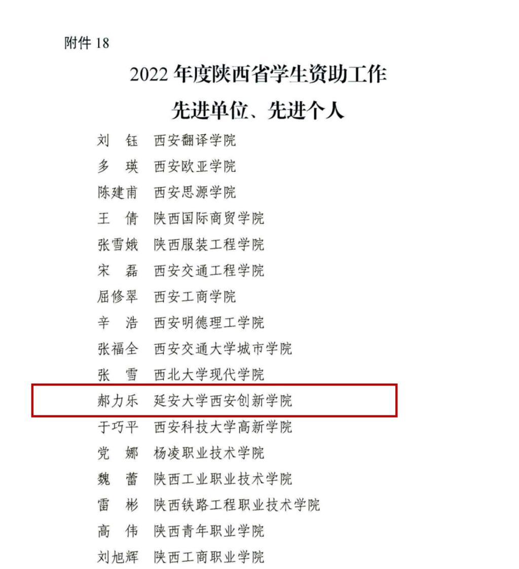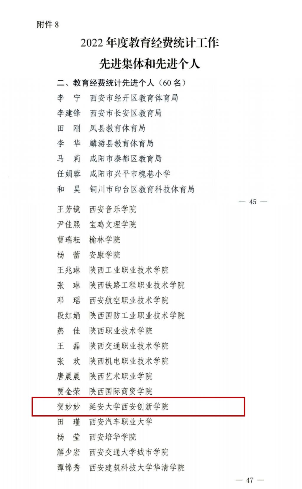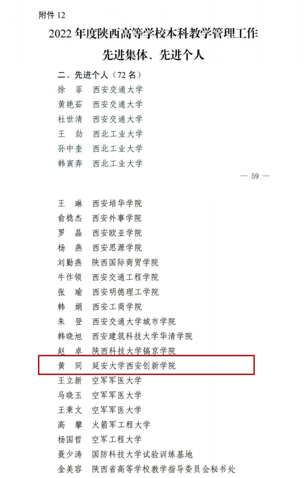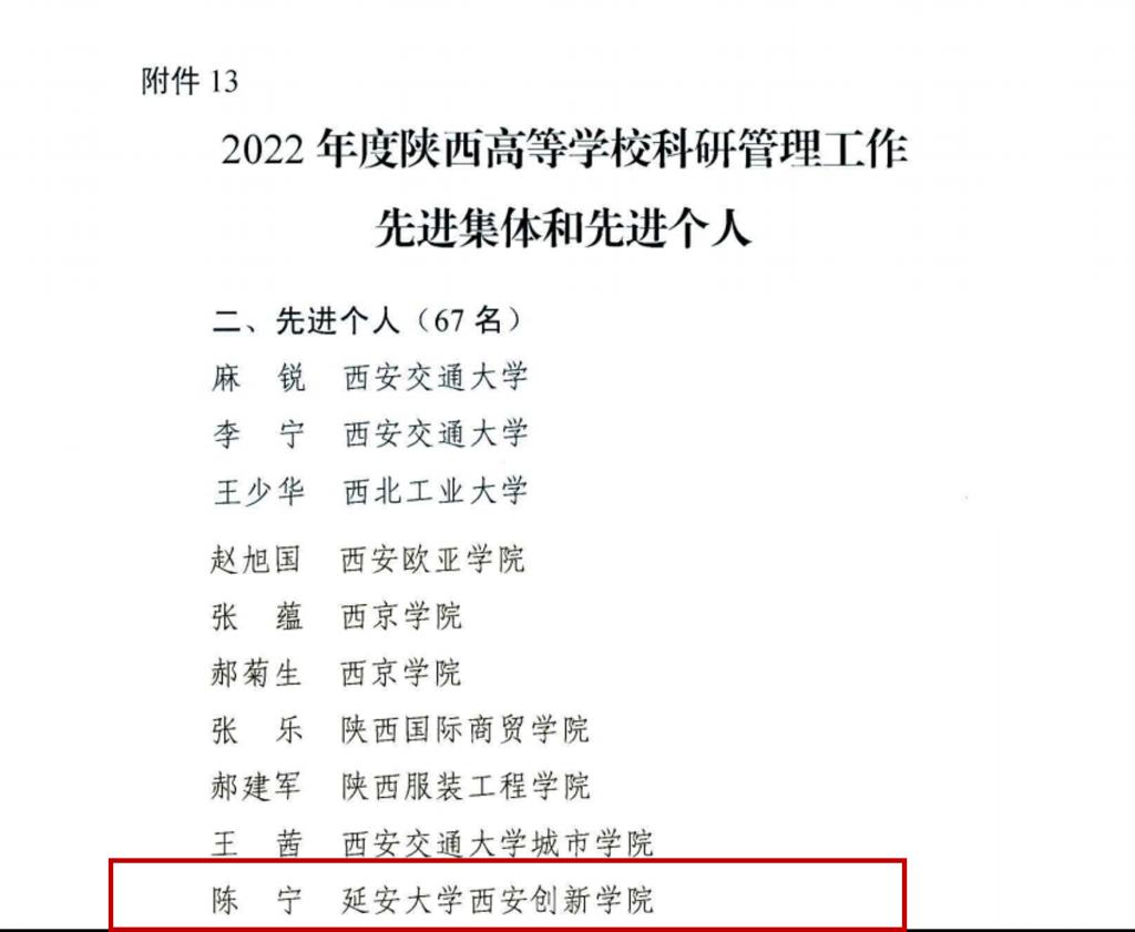 公司财务处会计贺妙妙荣获2022年度教育经费统计工作先进个人;教务处副处长黄同荣获2022年度陕西高等学校本科教学管理工作先进个人;科研处处长陈宁荣获2022年度陕西高等学校科研管理工作先进个人;员工处资助管理中心干事郝力乐荣获2022年度陕西省员工资助工作先进个人。