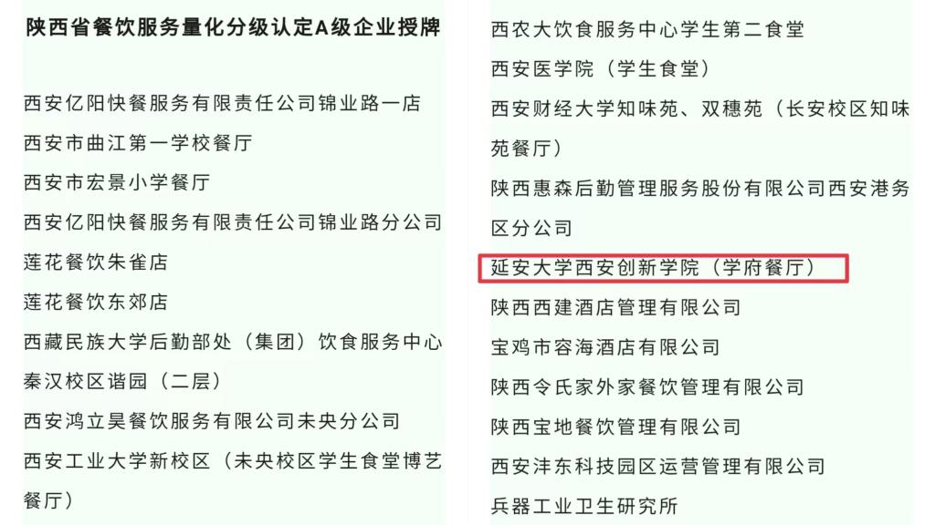 陕西省餐饮服务量化分级认定A级企业名单(部分)