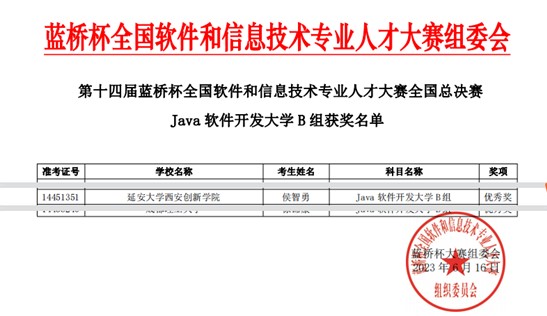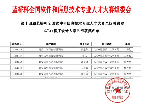 本网讯 近日,第十四届蓝桥杯全国软件和信息技术专业人才大赛软件类(个人赛)全国总决赛评奖结果揭晓,公司6名员工晋级全国总决赛,主要参加C/C++程序设计、Java软件开发2个软件类科目的比赛。在C/C++程序设计大赛 B 组中,计科2102班冯景帅获得二等奖,软件2001班李克获得三等奖,计科2001班沈子瑜、石晨欣、翟梦雨获得优秀奖,在Java 软件开发大赛 B 组中,软件2001班侯智勇获得优秀奖。