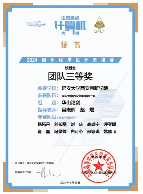 本网讯 近日,第九届中国高校计算机大赛团体程序设计天梯赛比赛结果揭晓,公司代表队荣获“陕西省团队三等奖”。